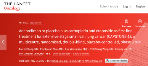 北京时间2022年5月14日,G22恒峰医药自主研发的PD-L1抑制剂阿得贝利单抗治疗广泛期小细胞肺癌的III期临床研究(CAPSTONE-1研究)成果正式全文在线发表于国际权威学术期刊《柳叶刀·肿瘤学》(《THE LANCET Oncology》,影响因子41.316)。CAPSTONE-1研究结果显示,阿得贝利单抗联合化疗一线治疗广泛期小细胞肺癌相较于安慰剂联合化疗可以显著延长患者总生存期至15.3个月[1],刷新现有免疫药物一线治疗广泛期小细胞肺癌的总生存纪录[2]。
